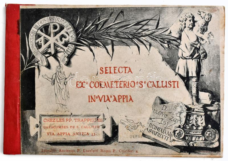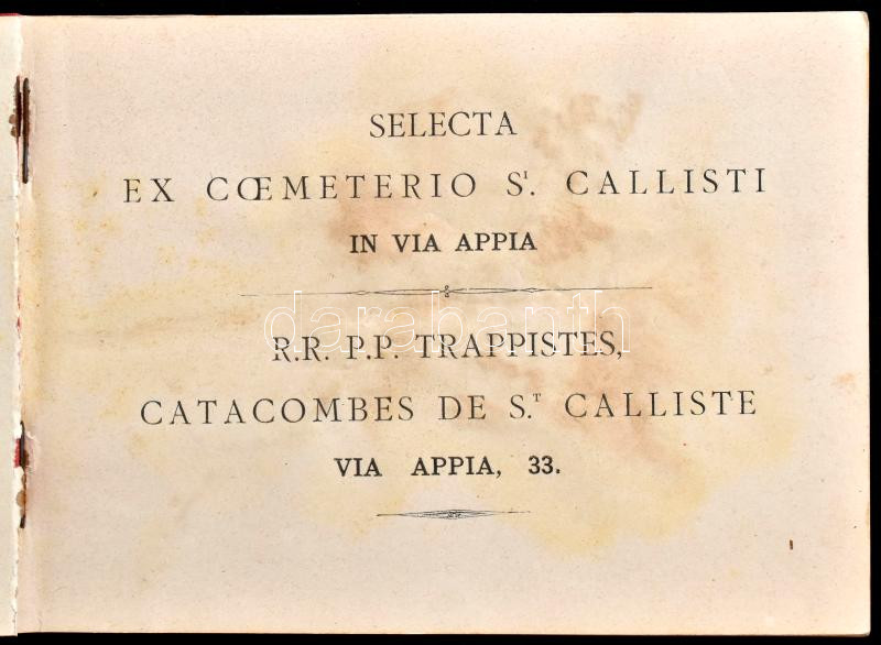 cca 1900 Selecta ex Coemeterio S. Callisti in Via Appia. A római katakombákat bemutató album, fekete-fehér képekkel, francia nyelvű bevezetővel. Félvászon-kötésben, helyenként kissé foltos, a belső kötéstáblán és a címlap hátoldalán szárított, préselt növényekkel, 16x11 cm
