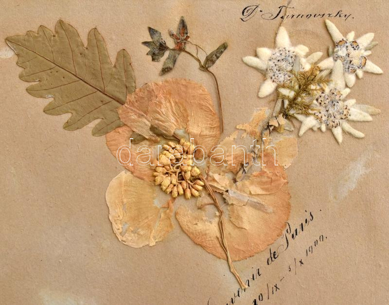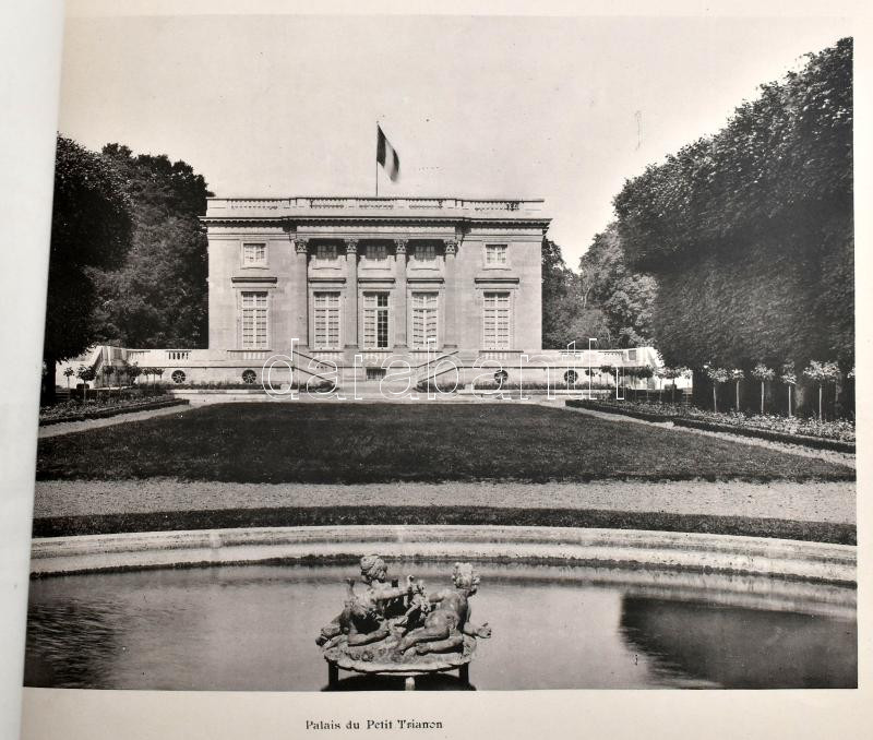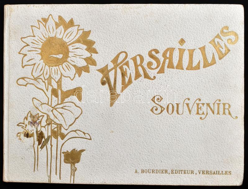 cca 1900 Versailles (Párizs), album 24 db fekete-fehér képpel (kastély belső termei, Kis-Trianon kastély, stb.), dekoratív, aranyozott borítóval, az előzéklapon szárított, préselt növényekkel (havasi gyopár), 24x18cm