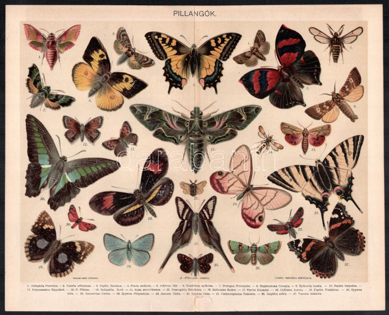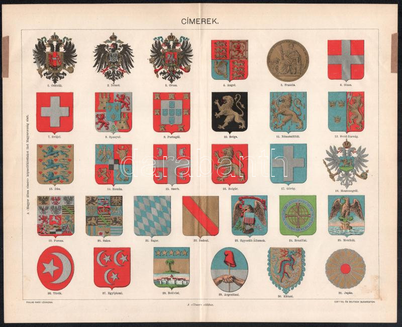 cca 1900 össz. 30 db szÃnes illusztráció a Pallas Nagy Lexikonából és Meyers Konversation-Lexikonból, klf. témákban (Magyar nemzeti viseletek I.-II., Magyarország cÃmere, az ezredéves kiállÃtás madártávlati képe, rendjelek, drágakövek, cÃmerek stb.), részben sérült és foltos, 25x31 cm körüli méretben