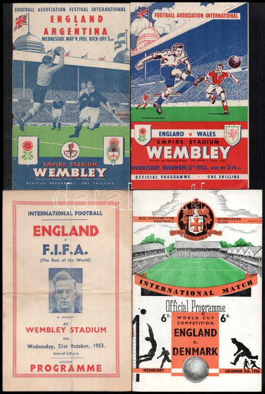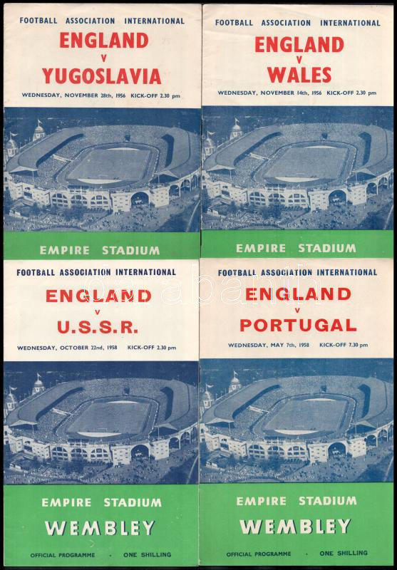 cca 1950-58 Angol labdarúgó válogatott 17 db meccsfüzete (Brazília, Németország, Szovjetúnió, Ausztria, Wales, Jugoszlávia stb.), vegyes, többségében jó állapotban / England national team, 17 football match booklets from the 1950s, against Brazil, Yugoslavia, USSR, West Germany, Asutria, Wales etc., mainly in good condition