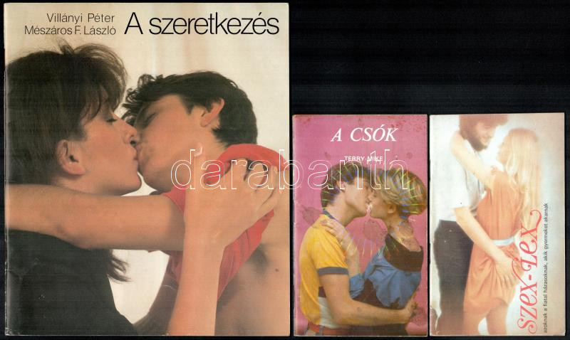 cca 1984-88 Szexuális felvilágosító kiadványok, össz. 3 db: illányi Péter, Mészáros F. László: A szeretkezés. Szexuális felvilágosító kiadvány. Bp., 1988, Pszichoteam, színes fotókkal illusztrált, tűzött papírkötésben + Terry-Mike: A csók. Papírkötés. Foltos, utolsó lap és hátsó borító összeragadt + Brencsán János-Töreky Ferenc: Szex-Lex. Bp., 1984, Medicina. Papírkötés