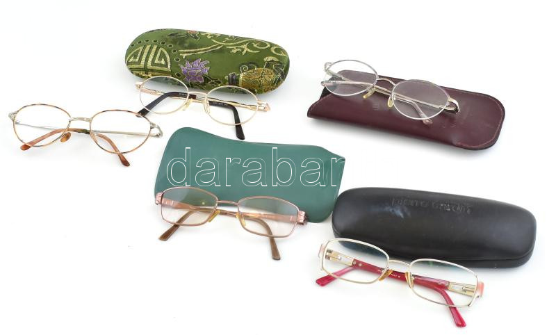 Beschreibung: 5 db olvasószemüveg, 4 db szemüvegtok, egyik Pierre Cardin felirattal. Kopott, változó állapotban