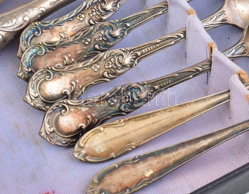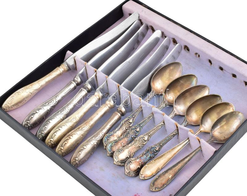 Beschreibung: Díszes, régi evőeszköz szett: 6 db ezüstözött nyelű, jelzett orosz/szovjet kés + 4 db ezüstözött desszertes kanál + 2 db egyéb, jelzett kiskanál. Koruknak megfelelő állapotban, dobozban.