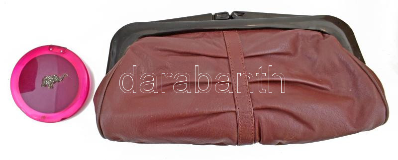 Beschreibung: Női retro barna műbőr kézitáska és műanyag púderes doboz, fedelén domború elefánt díszítéssel