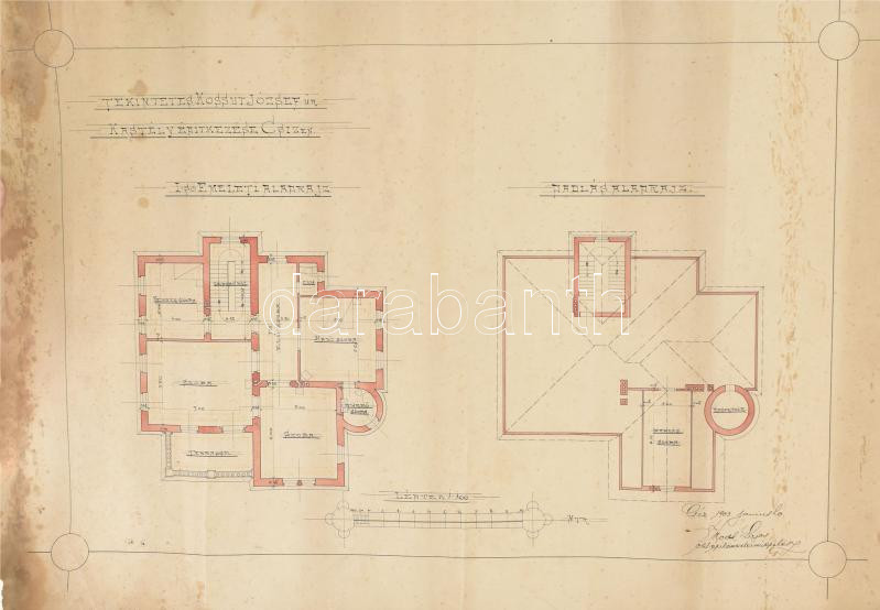 Beschreibung: 1903 Csíz/Cíz, Kossuth József csízi kastélyának tervrajzai, 2 db, foltosak, sérülésekkel, 43x59 cm