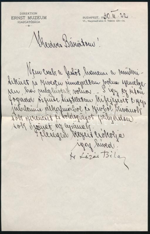 1930.III.22., Lázár Béla (1869-1950) művészeti író, az Ernst Múzeum igazgatójának autográf gratuláló levele Kézdi-Kovács László (1864-1942) festőművészhez pályája 40 éves jubileuma alkalmából. 1 kézzel írt oldal, Ernst Múzeum igazgatósága fejléces papíron, Lázár Béla autográf aláírásával, eredeti fejléces borítékban