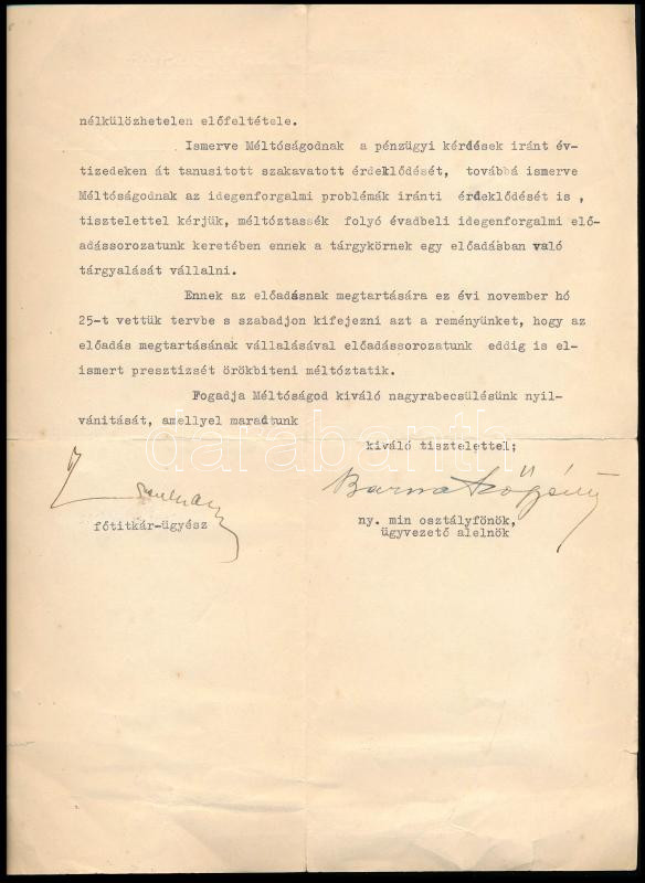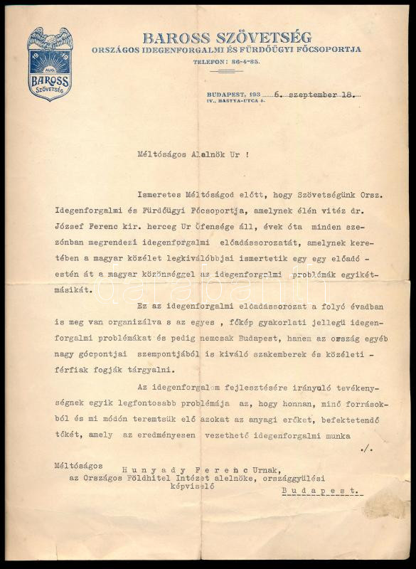 1936 Bp., Baross Szövetség Országos Idegenforgalmi és Fürdőügyi Főcsoportjának fejléces, gépelt levele Hunyady Ferenc kormányfőtanácsos, országgyűlési képviselő részére, kisebb lapszéli szakadásokkal