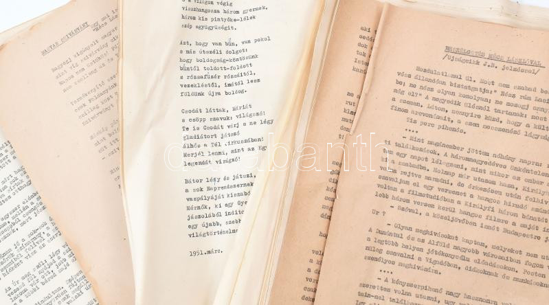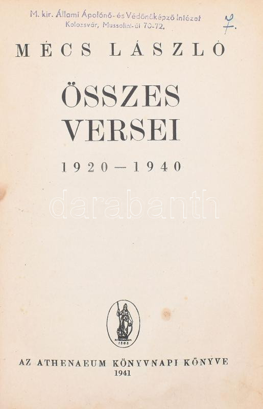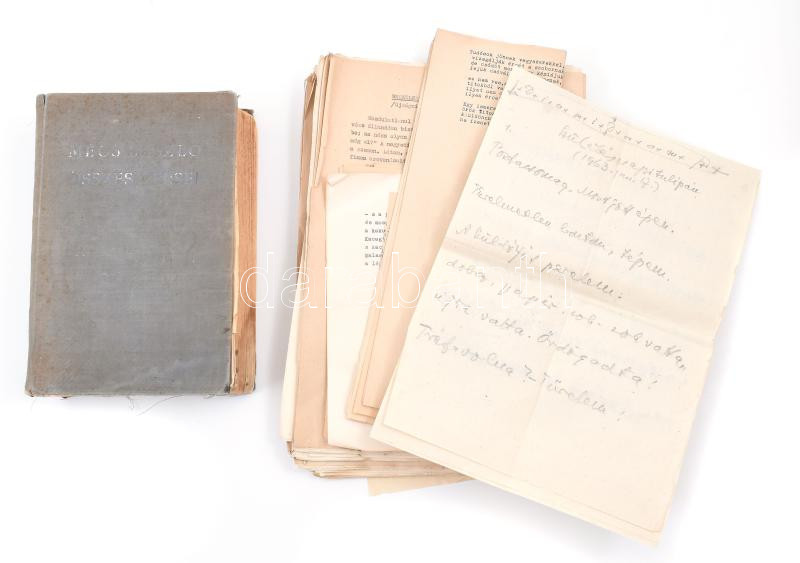 Mécs László (1895-1978) költő, szerzetes verseinek gépiratai, összesen 79 vers, közte 24, ami nem jelent meg eddig. + egy kéziratos vers. Vegyes állapotban, mappában. + Mécs László összes versei 1920-1940. Bp., 1941, Athenaeum. Kiadói egészvászon-kötés, viseltes, sérült állapotban, helyenként foltos, az előzéklap kijár, az utolsó két lap kiszakadt. A belső kötéstáblán Mécs László által aláírt, számozott ex libris-szel.