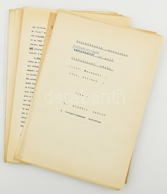 Merényi László: Hadimunkások mozgalmai Magyarországon az első világháború végén (1917. november - 1918. október). Gépirat, fűzés nélkül, tollal írt javításokkal, jegyzetekkel, 39+VII p.