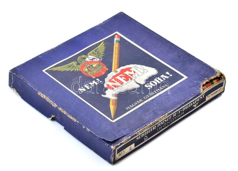 cca 1920 "Nem! Nem! Soha!" irredenta ceruzadoboz, benne 12 db "Nem! Nem! Soha!" irredenta ceruza, eredeti feliratos papírszalaggal körülragasztott bontatlan csomagban, Schuler József Rt. Budapest, doboz sérült, 19×18×2,7 cm