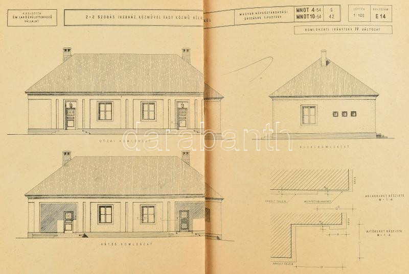 cca 1950-1970 2x2 szobás iker lakóház, közművel, városias homlokzattal. Magyar Népköztársaság országos típusterv. Építési tervrajz-dokumentáció, 19 oldalon (hiányos), részben szétvált tűzéssel, helyenként sérült lapokkal, 43x30 cm