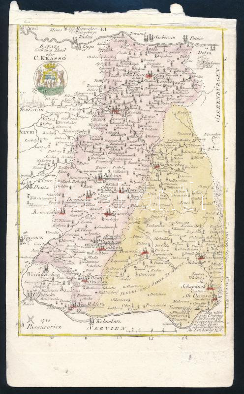 1804 Krassó vármegye térképe. C[omitatus] Krassó[viensis], rajta: Lugos, Karánsebes, Orsova, Resica, Temesvár, In: [Korabinszky János Mátyás]: Korabinsky, Johann Matthias: Atlas Regni Hungariae Portatilis [XLVII.] Bécs, 1804. Schaumburg und Compagnie, színezett rézmetszet, 17x11 cm.