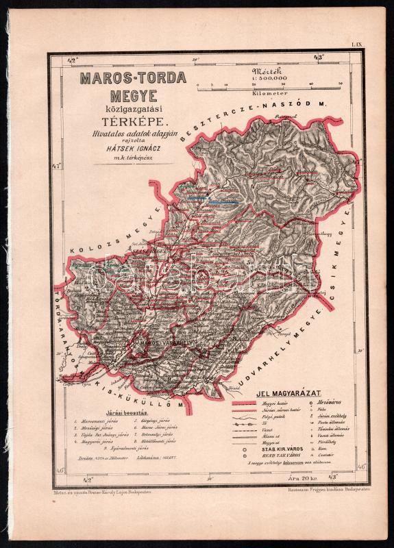 1880 Hátsek Ignác (1827-1902): Maros-Torda megye közigazgatási térképe, rajta Marosvásárhely, Szászrégen...stb, 1:500.000, Bp., Rautmann Frigyes,(Posner Károly Lajos-ny.), a helységek neveit kézzel aláhúzták, 30x22 cm