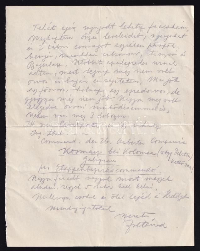 1915 Reiss Zoltán (1877-1945) magyar mérnök-főhadnagy, építész I. világháborús levele feleségének Kosmáczból feleségéhez érkezése után, sok érdekes részlettel. Reiss Zoltán 1915-ben rokkant állományúként önként jelentkezett a hadseregbe, ahol népfölkelő mérnök hadnaggyá nevezték ki. A k. u. k. 7. Hadsereg körzetébe, Galiciába került. Itt a zielona-nadwornai és a kosmácz-ardzéluzai utak és hidak építését vezette. Ezután Radócba (Bukovina (régió) került, ahol erődök építésével foglalkozott. 5 beírt oldal.