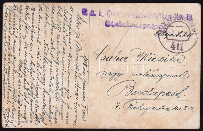 Beschreibung: 1918 I világháborús tábori posta K.u.k. Quartiermeisterabteilung No. 18 Stabskompagnie bélyegzőjével.