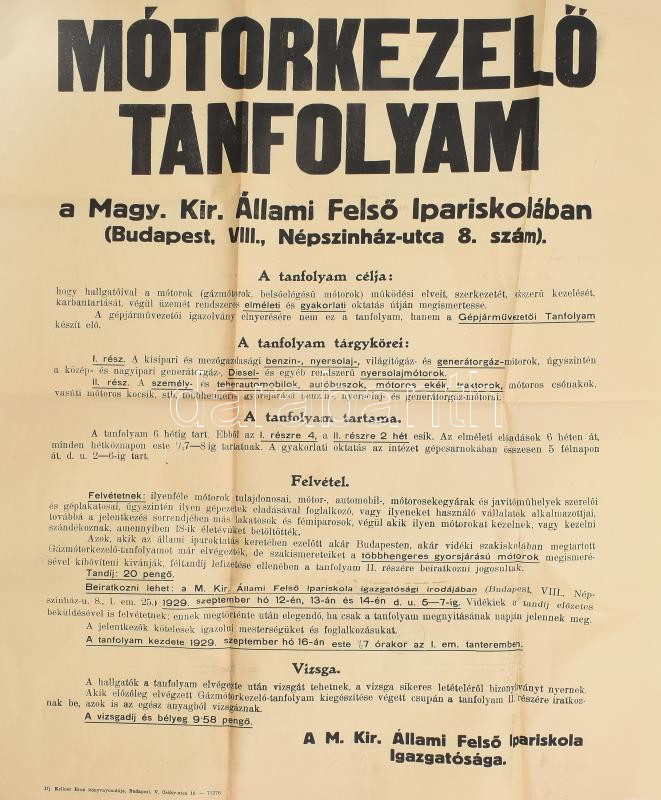 1929 Motorkezelői tanfolyam nagy méretű plakát 50x70 cm https://www.darabanth.com/de/437-Fernauktion/437.0/Kunst-Dokumente-andere-Sammelgebiete/Plakat~1000010/1929-Motorkezeloi-tanfolyam-nagy-meretu-plakat-50x70-cm~II2844009