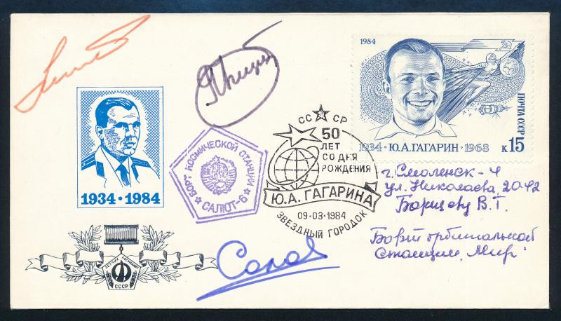 Oleg Atkov (1949-), Vlagyimir Szolovjov (1946- ) és Leonyid Kizim (1941-2010) szovjet űrhajósok aláírásai emlék borítékon / Signatures of Vladimir Solovjov (1946- ) and Leonid Kizim (1941-2010), Oleg Atkov (1949-) Soviet astronauts on cover