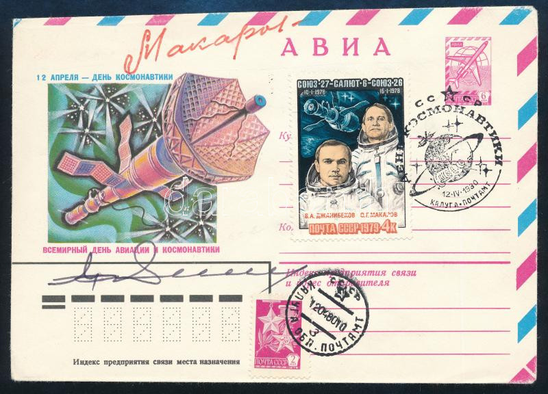 Beschreibung: Vlagyimir Dzsanyibekov (1942- ), és Oleg Makarov (1933-2003) szovjet űrhajósok aláírásai emlékborítékon / Signatures of Vladimir Dzhanibekov (1942- ), Oleg Makarov (1933-2003) Soviet astronauts on envelo