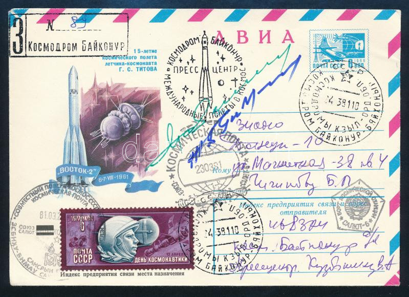 Vlagyimir Dzsanyibekov (1942- ) szovjet és Dzsugderdemidín Gurragcsá (1947- ) mongol űrhajósok aláírásai emlékborítékon / Signatures of Vladimir Dzhanibekov (1942- ) Soviet and Jügderdemidiin Gurragchaa Mongolian astronauts on envelope