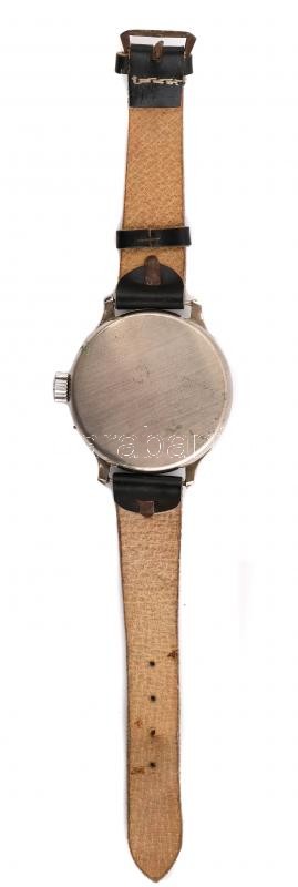 Beschreibung: International Watch Co. (IWC) Schaffhausen karóra, kézi felhúzós, beépített zsebóra szerkezet, másodpercmutatós, kissé sérült számlappal, bőr szíjjal, működik, d: 43 mm