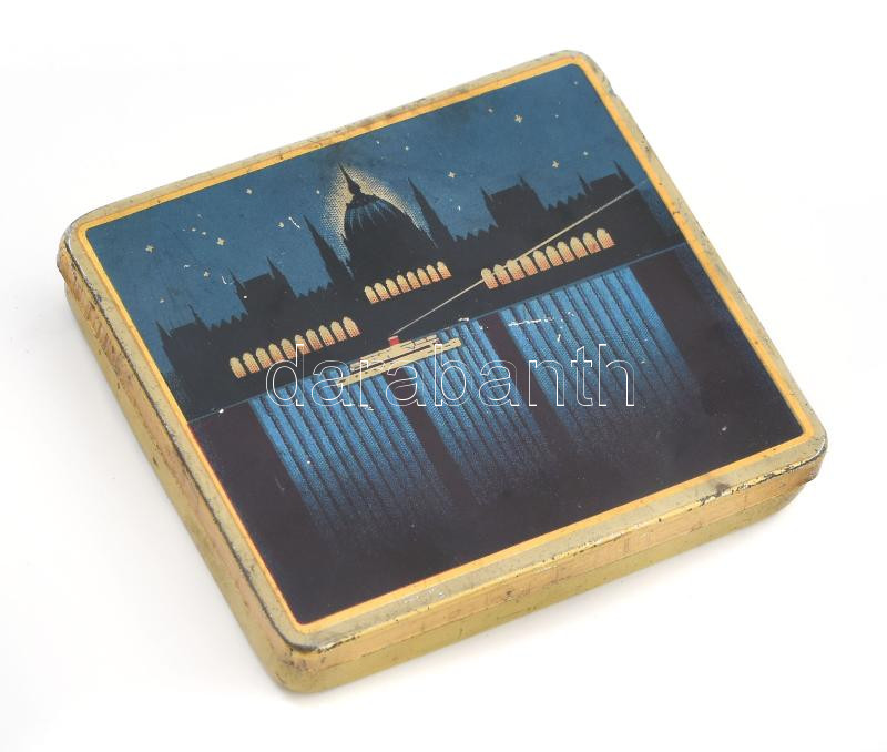 Beschreibung: A Parlament éjszakai látképével díszített, art deco stílusú (cigarettás, szivarkás) pléh doboz, némi kopással, 9x8x1,5 cm