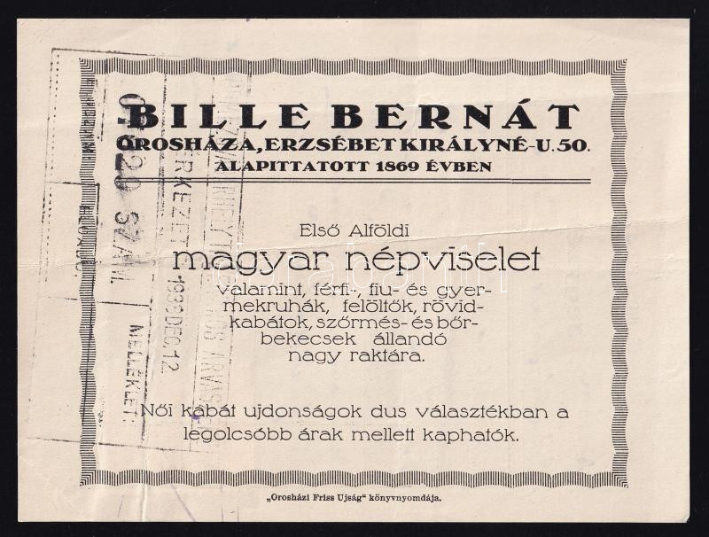 cca 1930 Orosháza 2 db reklám nyomtatvány, számla https://www.darabanth.com/de/437-Fernauktion/437.0/Kunst-Dokumente-andere-Sammelgebiete/Werbungen~500025/cca-1930-Oroshaza-2-db-reklam-nyomtatvany-szamla~II2844910