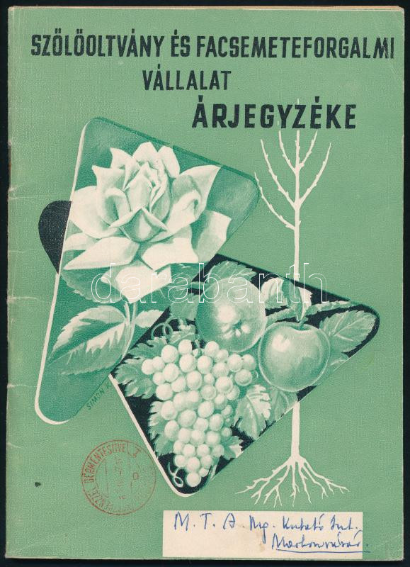 cca 1960 Szőlőoltvány és Facsemeteforgalmi Vállalat árjegyzéke. Bp., E... https://www.darabanth.com/de/437-Fernauktion/437.0/Kunst-Dokumente-andere-Sammelgebiete/Werbungen~500025/cca-1960-Szolooltvany-es-Facsemeteforgalmi-Vallalat-arjegyzeke-Bp-Egyetemi-ny-68-p-Kiad~II2760873
