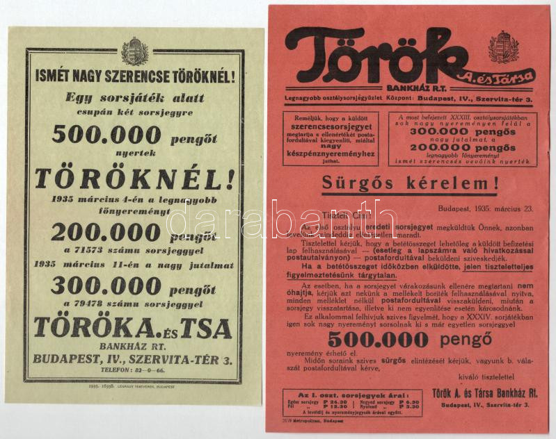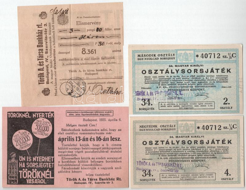 1935. "35. Magyar Királyi Osztálysorsjáték" 2. és 4. osztály 1/8 sorsjegye, felülbélyegzéssel, vízjeles papíron, a sorsjegyekhez tartozó kitöltött elismervénnyel, tájékoztató levéllel és reklámanyaggal T:AU