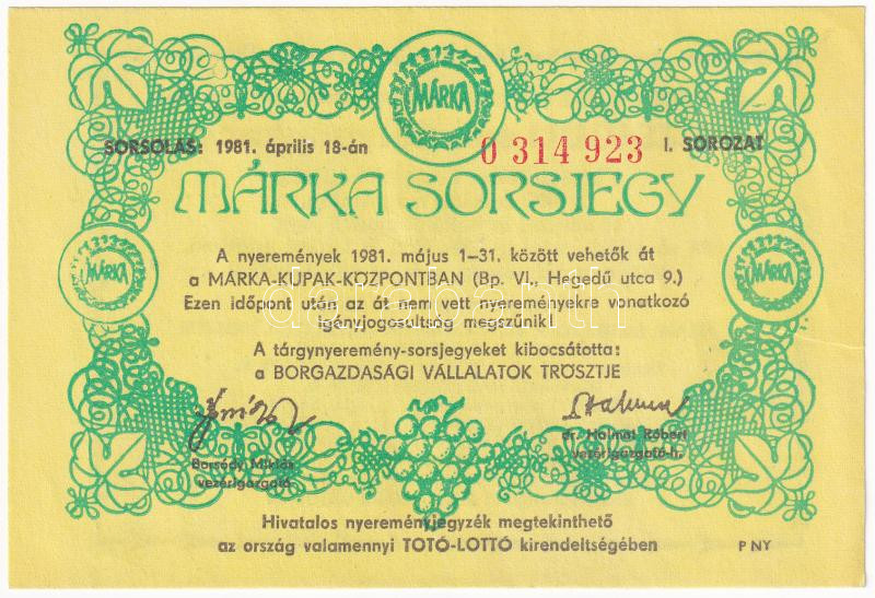 1981. "Márka Sorsjegy" I. sorozat, "0 314 923" sor... https://www.darabanth.com/de/437-Fernauktion/437.0/Numismatik/Aktien-und-Tickets~2000005/1981-Marka-Sorsjegy-I-sorozat-0-314-923-sorszamu-sorsjegye-TAU-kis-sarokhajlas~II2845894