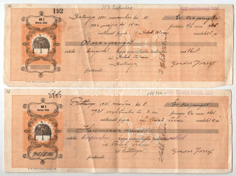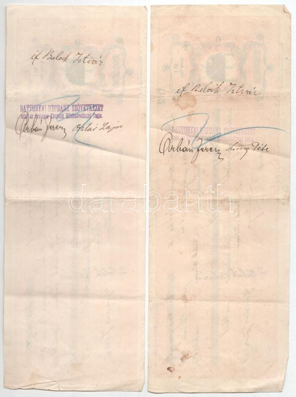 Battonya ~1929-1931. 6db-os kitöltött váltó tétel vízjeles papír, bély... https://www.darabanth.com/de/437-Fernauktion/437.0/Numismatik/Aktien-und-Tickets~2000005/Battonya-7E1929-1931-6db-os-kitoltott-valto-tetel-vizjeles-papir-belyegekkel-Battonyai-NC3~II2836386