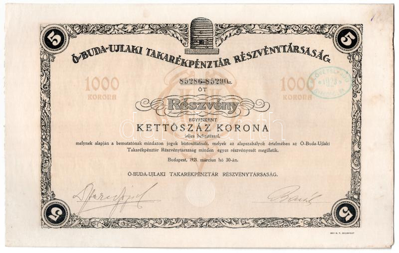 Budapest, 1921. "Ó-Buda-Újlaki Takarékpénztár Részvénytársaság&qu... https://www.darabanth.com/de/437-Fernauktion/437.0/Numismatik/Aktien-und-Tickets~2000005/Budapest-1921-O-Buda-Ujlaki-Takarekpenztar-Reszvenytarsasag-5-reszvenye-egyenkent-20~II2838096