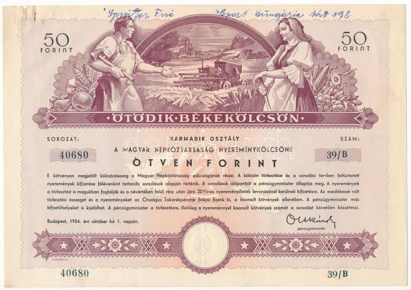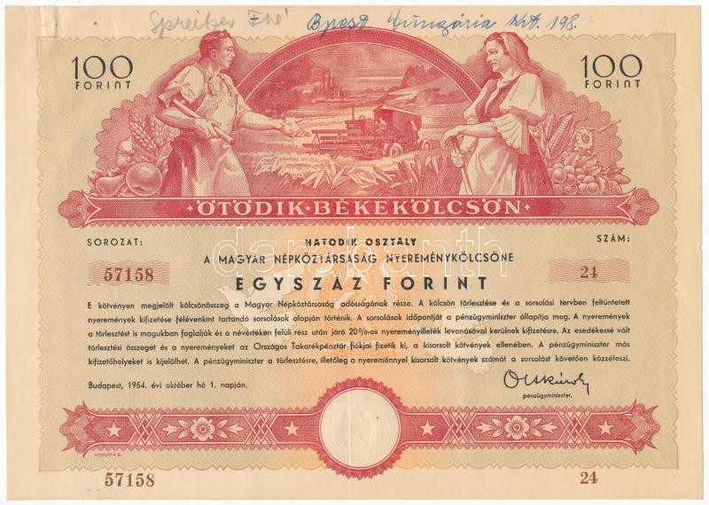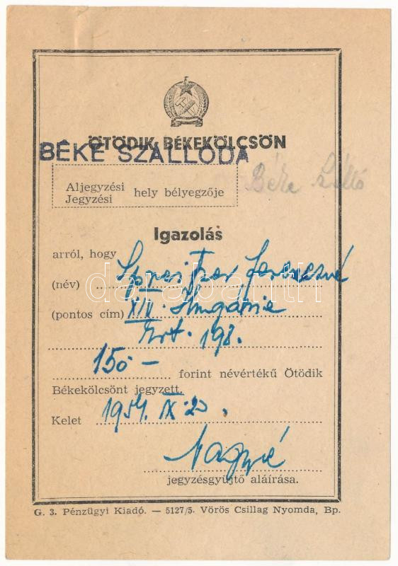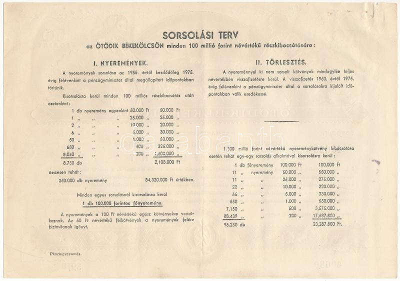 Budapest 1954. "Ötödik Békekölcsön" nyereménykölcsön kötvény... https://www.darabanth.com/de/437-Fernauktion/437.0/Numismatik/Aktien-und-Tickets~2000005/Budapest-1954-Otodik-Bekekolcson-nyeremenykolcson-kotveny-100Ft-rol-szarazpecsettel~II2810604