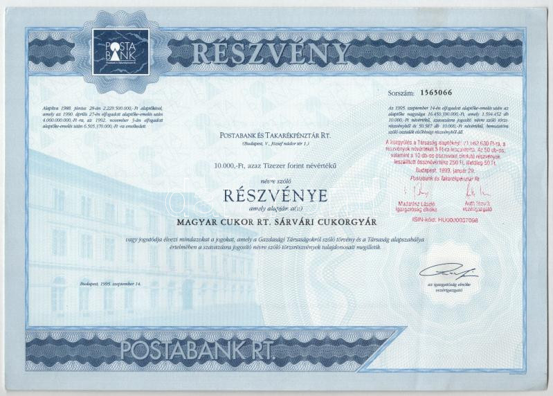 Budapest 1995. "Postabank és Takarékpénztár Rt." részvénye 1... https://www.darabanth.com/de/437-Fernauktion/437.0/Numismatik/Aktien-und-Tickets~2000005/Budapest-1995-Postabank-es-Takarekpenztar-Rt-reszvenye-10000Ft-rol-szelvenyekkel-es-b~II2843035