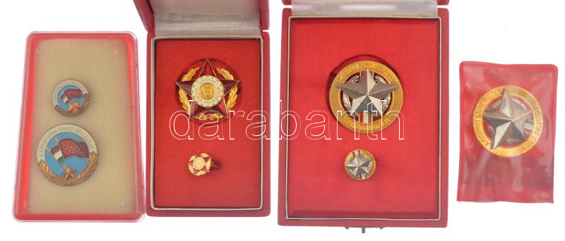 ~1970. "Az Ipari Szövetkezet Kiváló Dolgozója" aranyozott, zománcozott fém kitüntető jelvény (2db, az egyik miniatűrrel, eredeti tokban) + "Könnyűipar Kiváló Dolgozója aranyozott, zománcozott fém kitüntető jelvény" miniatűrrel, eredeti tokban + "Gépipar Kiváló Dolgozója" aranyozott, zománcozott fém kitüntető jelvény miniatűrrel, eredeti tokban T:UNC,AU