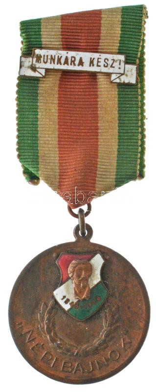 Beschreibung: 1948. "Népi Bajnok" bronz asztalitenisz díjérem zománcozott "Petőfi" rátéttel az 1848-1849-es forradalom 100. évfordulója alkalmából, nemzetiszín mellszalagon "Munkára kész!" zománcozott felirattal (36mm) T:2
