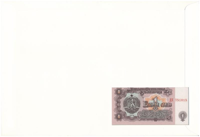 Bulgar... https://www.darabanth.com/de/437-Fernauktion/437.0/Numismatik/Umschlage-mit-Munzen-und-Banknoten~2000004/Bulgaria-1974-1L-felbelyegzett-boritekban-belyegzessel-TUNC-Bulgaria-1974-1-Leva-in-envel~II2846874