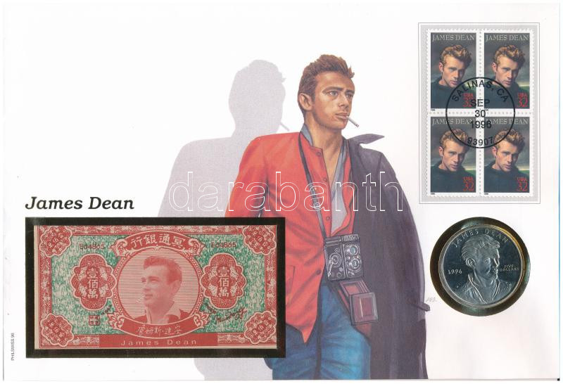 Marshall-szigetek 1996R 5$ Cu-Ni "James Dean" valamint 1.000.000 égetési pénzzel (Hell banknote), érmés borítékban, első napi bélyegzéses bélyeggel T:PP Marshall Islands 1996R 5 Dollars Cu-Ni "James Dean" and 1.000.000 Hell banknote in coin envelope with first day of issue stamp and cancellation C:PP Krause KM#303