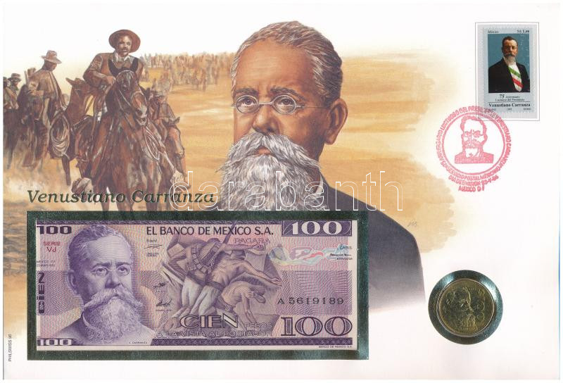 Mexikó 1982. 100P + 1992. 100P "Venustiano Carranza" érmés é... https://www.darabanth.com/de/437-Fernauktion/437.0/Numismatik/Umschlage-mit-Munzen-und-Banknoten~2000004/Mexiko-1982-100P-plus-1992-100P-Venustiano-Carranza-ermes-es-bankjegyes-felbelyegzett-borite~II2847503