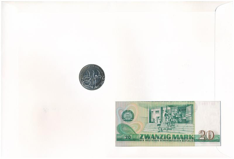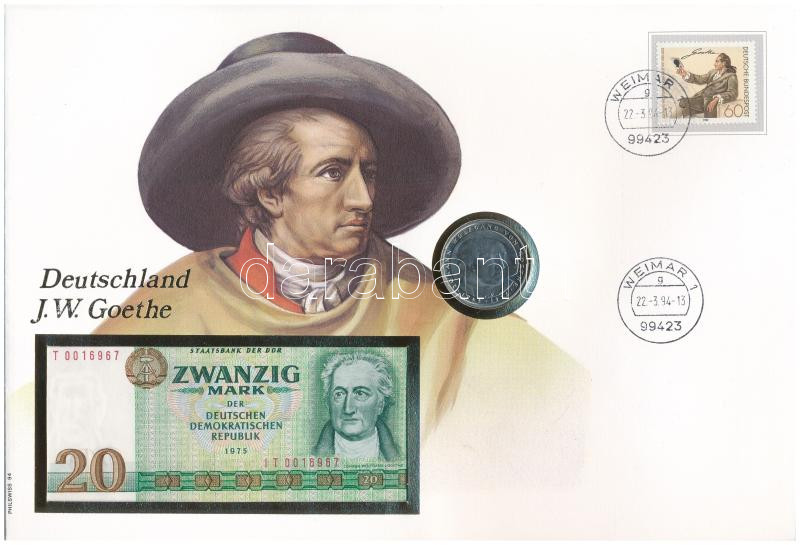 NDK / NSZK érmés és bankjegyes, pecsételt boríték benne NSZK 1982. 5M Cu-Ni "Johann Wolfgang Goethe halálának 150. évfordulój" érmével és NDK 1975. 20M-ás bankjeggyel, német nyelvű leírással T:UNC