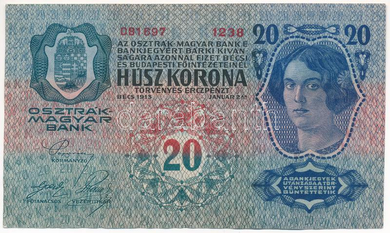 1913. 20K T:III kis beszakadás Adamo K17 https://www.darabanth.com/de/437-Fernauktion/437.0/Numismatik/Ungarische-Banknoten~2000007/1913-20K-TIII-kis-beszakadas-Adamo-K17~II2836924