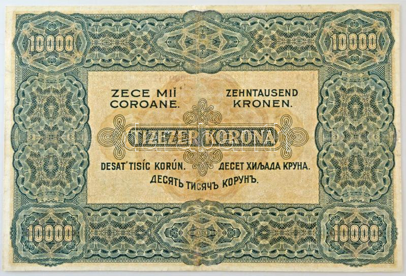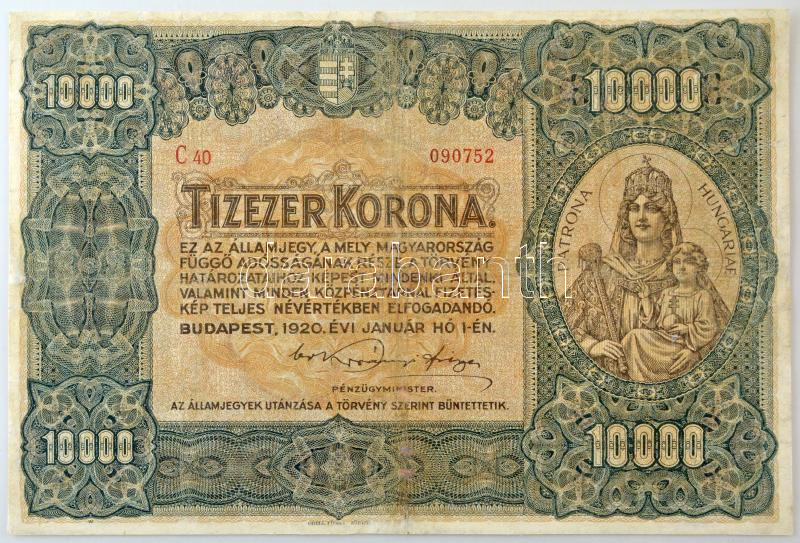 1920. 10.000K "Orell Füssli Zürich" barna sorozat- és sorszámmal "C40 0090752" T:III restaurált Hungary 1920. 10.000 Korona "Orell Füssli Zürich" with brown series and serial numbers "C40 0090752" C:F restored Adamo K41