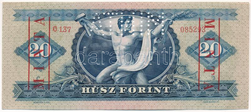 1957. 20Ft "C137 - 085293" sorozat és sorszámmal, piros "MINTA" felülnyomással és perforációval T:AU / Hungary 1957. 20 Forint with "C137 - 085293" serial number and with red "MINTA" (SPECIMEN) overprint and perforation C:AU Adamo F11M