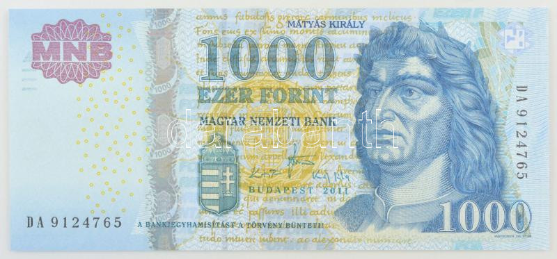 2011. 1000Ft "DA" T:UNC,AU https://www.darabanth.com/de/437-Fernauktion/437.0/Numismatik/Ungarische-Banknoten~2000007/2011-1000Ft-DA-TUNC-AU~II2839004