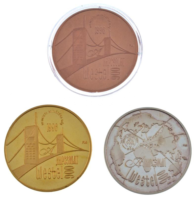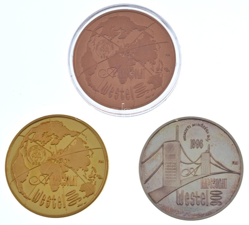 Fritz Mihály (1947-) 1996. "Westel 900 - A kapcsolat - Nemzeti minőségi díj" (3xklf) aranyozott bronz, ezüstözött bronz és bronz emlékérmek, az egyik kapszulában, a másik kettő dísztokban (42mm/db) T:AU (PP) patina, ujjlenyomat, kis karc