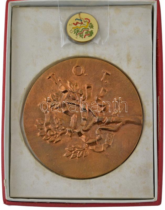 Somogyi Árpád (1926-) ~1980. "T.O.T. (Termelőszövetkezetek Országos Tanácsa) / Kiváló Termelőszövetkezeti Munkáért" kétoldalas, öntött bronz emlékérem (95mm) + "T.O.T." műgyantás kitüntető jelvény (26mm) T:AU