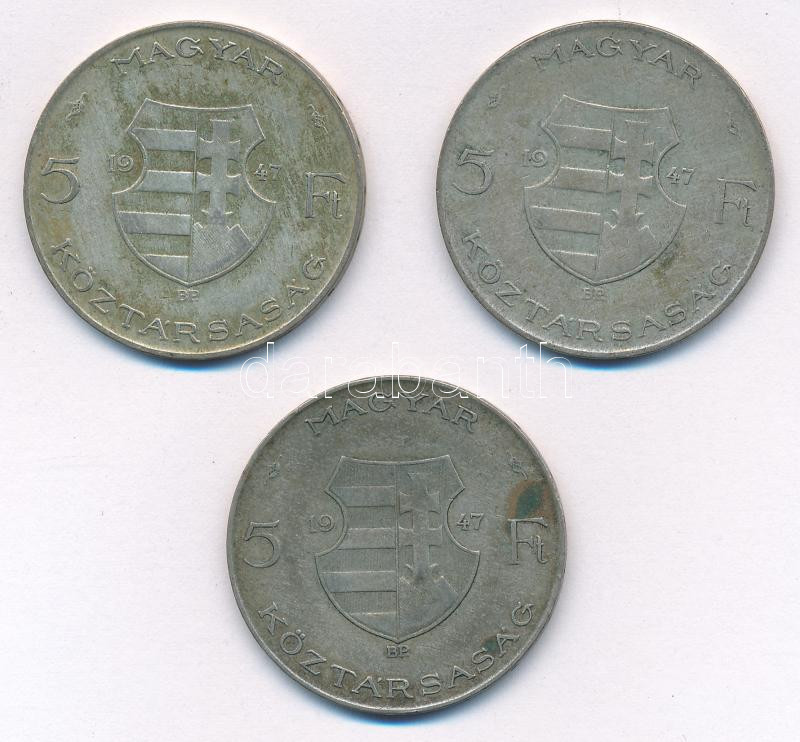 1947. 5Ft Ag "Kossuth" (3x) T:F patina Adamo F8.1 https://www.darabanth.com/de/437-Fernauktion/437.0/Numismatik/Ungarische-Munzen-und-Munzen-mit-ungarischem-Munzzeichen~2000008/1947-5Ft-Ag-Kossuth-3x-TF-patina-Adamo-F81~II2841731