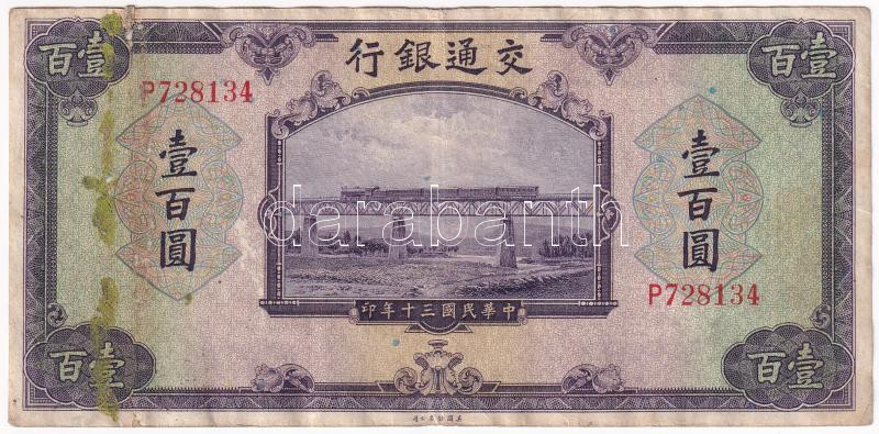 Beschreibung: Kínai Köztársaság / Bank of Communications 1941. 100Y T:F fo. Chinese Republic / Bank of Communications 1941. 100 Yuan C:F spotted Krause P#162
