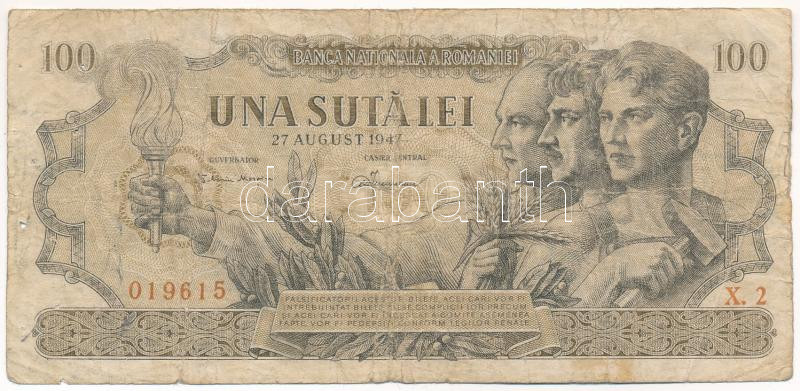 Romania 1947. 100 Lei "X.2 019615" C:VG holes