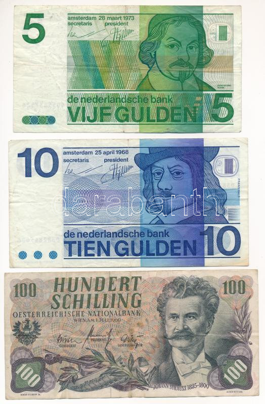 Mi... https://www.darabanth.com/de/437-Fernauktion/437.0/Numismatik/Weltweit-Banknoten~2000013/Vegyes-Ausztria-1960-100Sch-plus-Hollandia-1973-5G-plus-1968-10G-TF-Mixed-Austria-1960-100-Schilli~II2844459