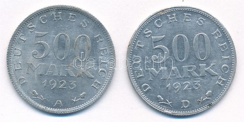 Németország / Weimari Köztársaság 1923A,D 500M Al (2xklf) T:2 patina, kis karc Germany / Weimar Republic 1923A,D 500 Mark Al (2xdiff) C:XF patina, small scratches Krause KM#36